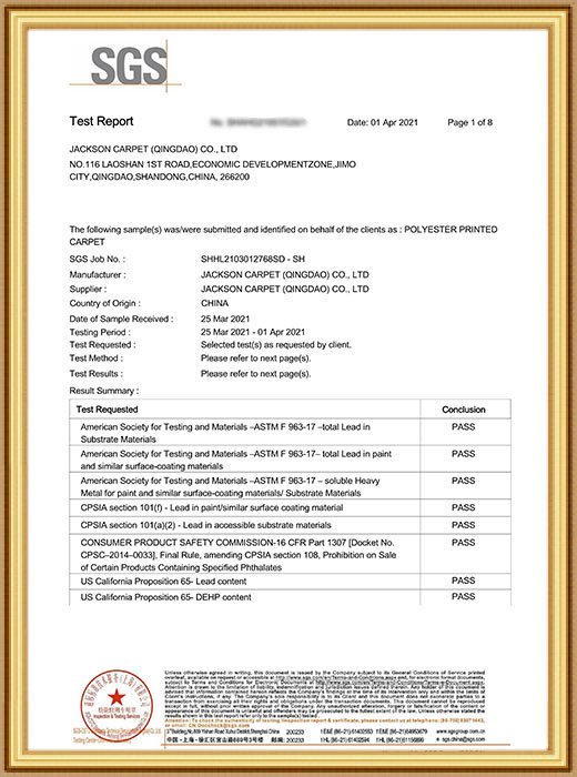 The quality of the company's products is stable, all the carpets and handmade carpets have passed the CCPSA & ASTM F 963-17 test by SGS.