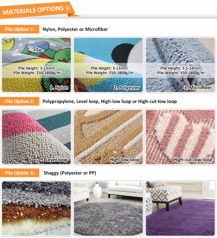 2. Surface materials could be nylon, polyester Microfiber or Polypropylene. And with different pile style and pile height.